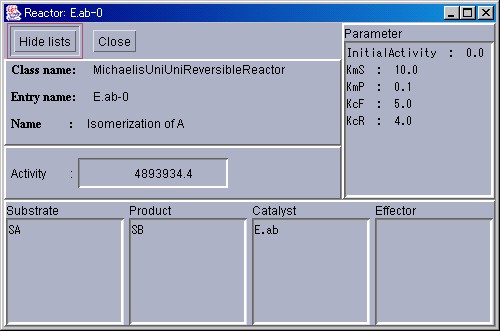 この画面では、あるReactorについて、その名前、使用している反応式の 種類、反応の活性値が表示されます。"Show lists"ボタンを押すと、更に 詳細な情報が表示され、"Close"ボタンを押すと画面が閉じます。