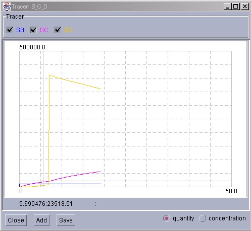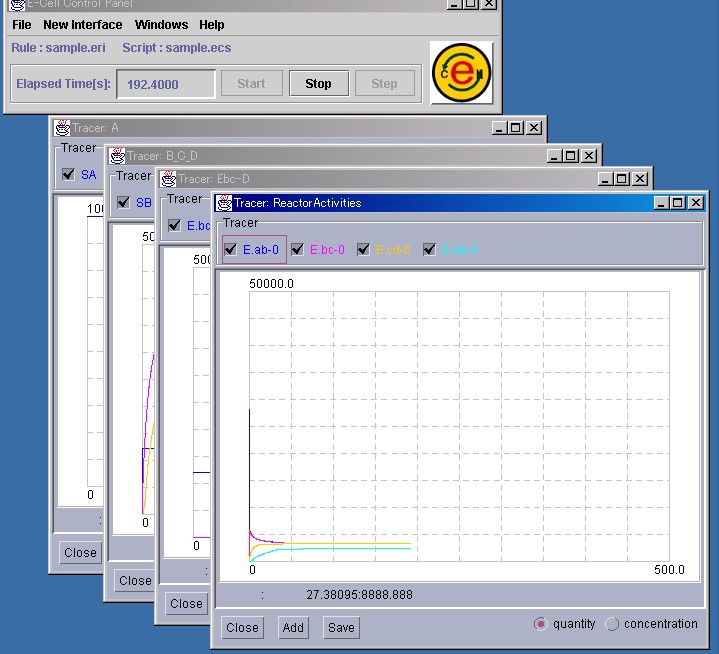 ルールに従って、Substanceの量や、Reactorの活性の変化がTracerに 表示されます。Tracerに表示されたシミュレーションの結果は、Tracerの "Save"ボタンを押すと保存できます。詳細は、3.2.7節を 参照して下さい。