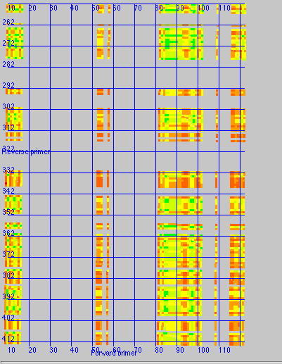 The horizontal grid represents location of the first 5' base of a forward primer in the Plus Strand, with the 5' end on the left